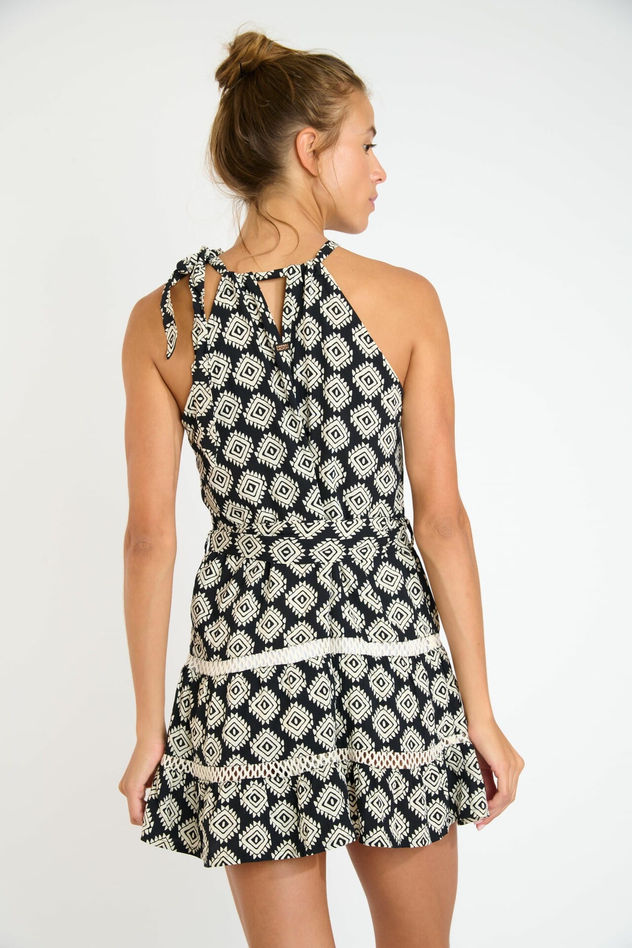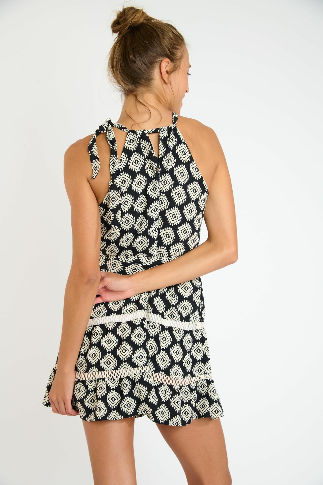 Craquez pour cette robe courte de plage au motif graphique noir et à l’encolure halter qui met en valeur les épaules. Légère, féminine et facile à porter, elle accompagne parfaitement vos journées d’été et complète idéalement vos looks de plage.